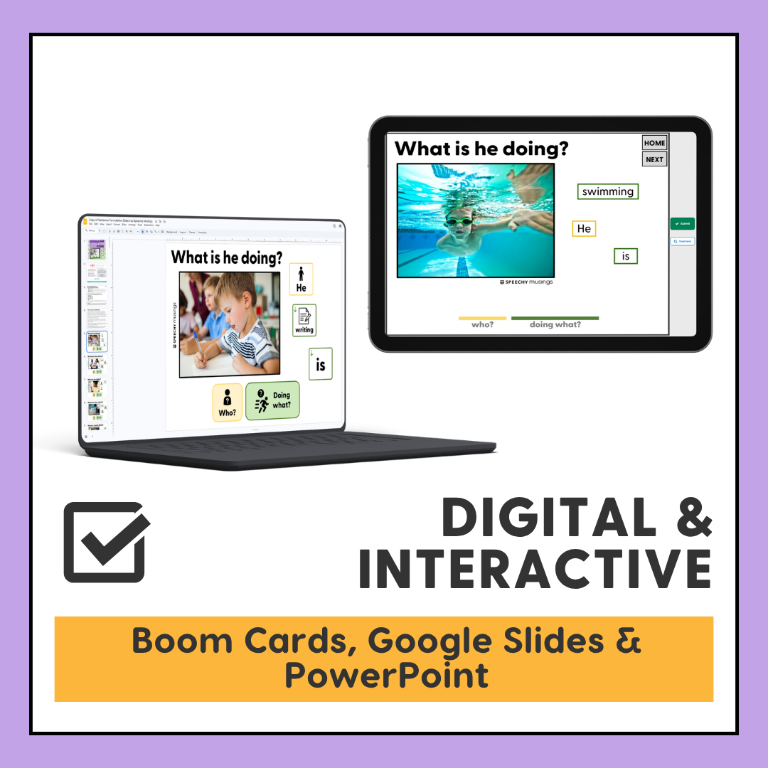 Target WH questions, formulating sentences, and early syntax with this digital, drag-and-drop, sentence building activity! Because it uses real pictures and age-appropriate, simple icons, it can be used with a wide variety of students, ages, and levels!