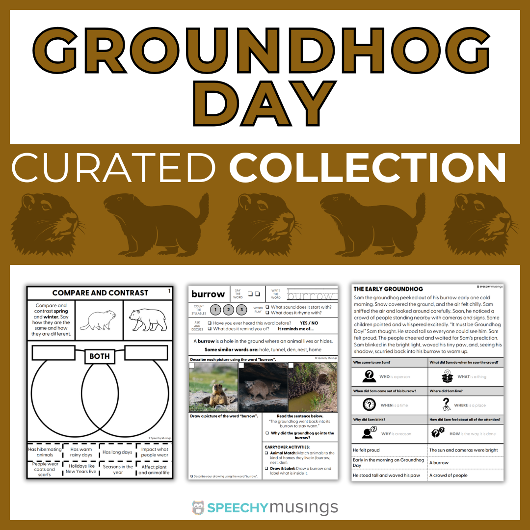 Make speech therapy both fun and effective with the Groundhog Day Curated Collection! This exciting resource is designed to engage students with no-prep worksheets that target essential language skills such as vocabulary, compare and contrast, sequencing, WH questions, story grammar, problem-solving, and comprehension. Perfect for mixed groups, it offers seasonal content that keeps students motivated while addressing a wide range of language goals.