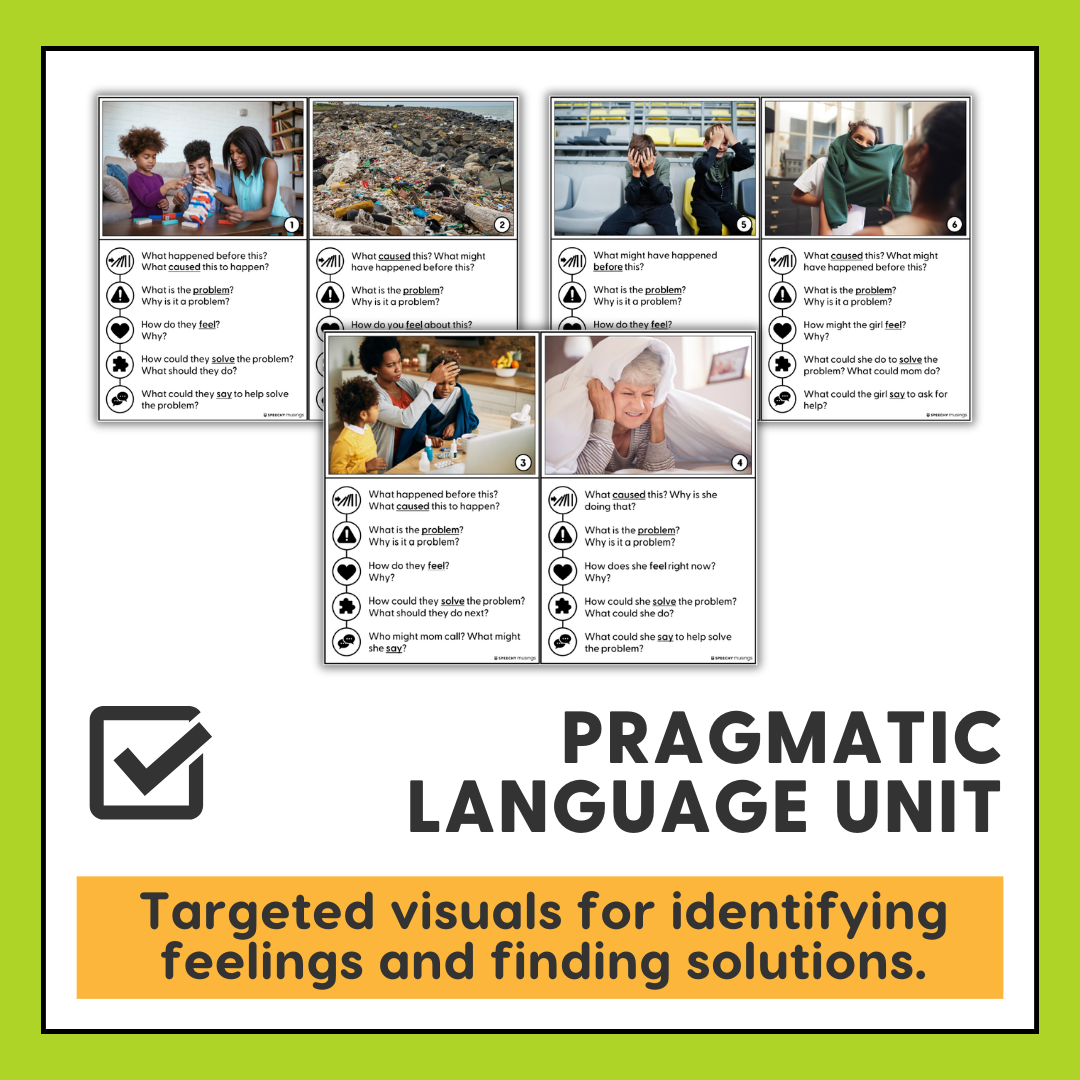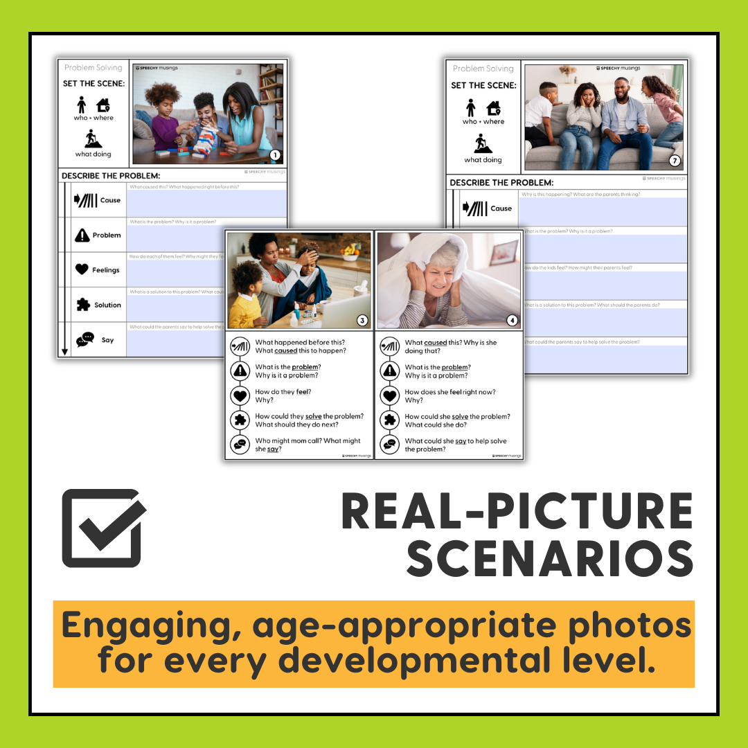 I love how Shannon has broken down problem solving into clear methodical steps by teaching students to identify “cause, problem, feelings, solution,” and “speaking/self advocacy.” A plus is if you have other problem solving resources her visuals for problem solving can be used with those as well and it can also be used to target inferences. I would have preferred more pictured problems relatable to student’s everyday lives. For example there is a photo of trash littering a beach, and while it illustrates a problem, it may not be as critical as problems with social interactions and managing everyday frustrations. But all in all I still recommend Problem Solving Scenarios For Speech Therapy .