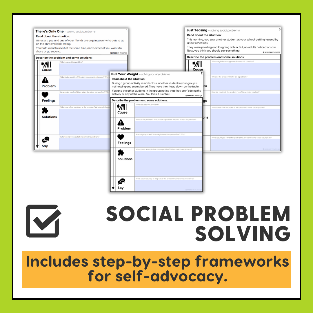 This problem solving resource for speech therapy facilitates improved understanding of problems, their causes, and how to solve problems including a self-advocacy component.