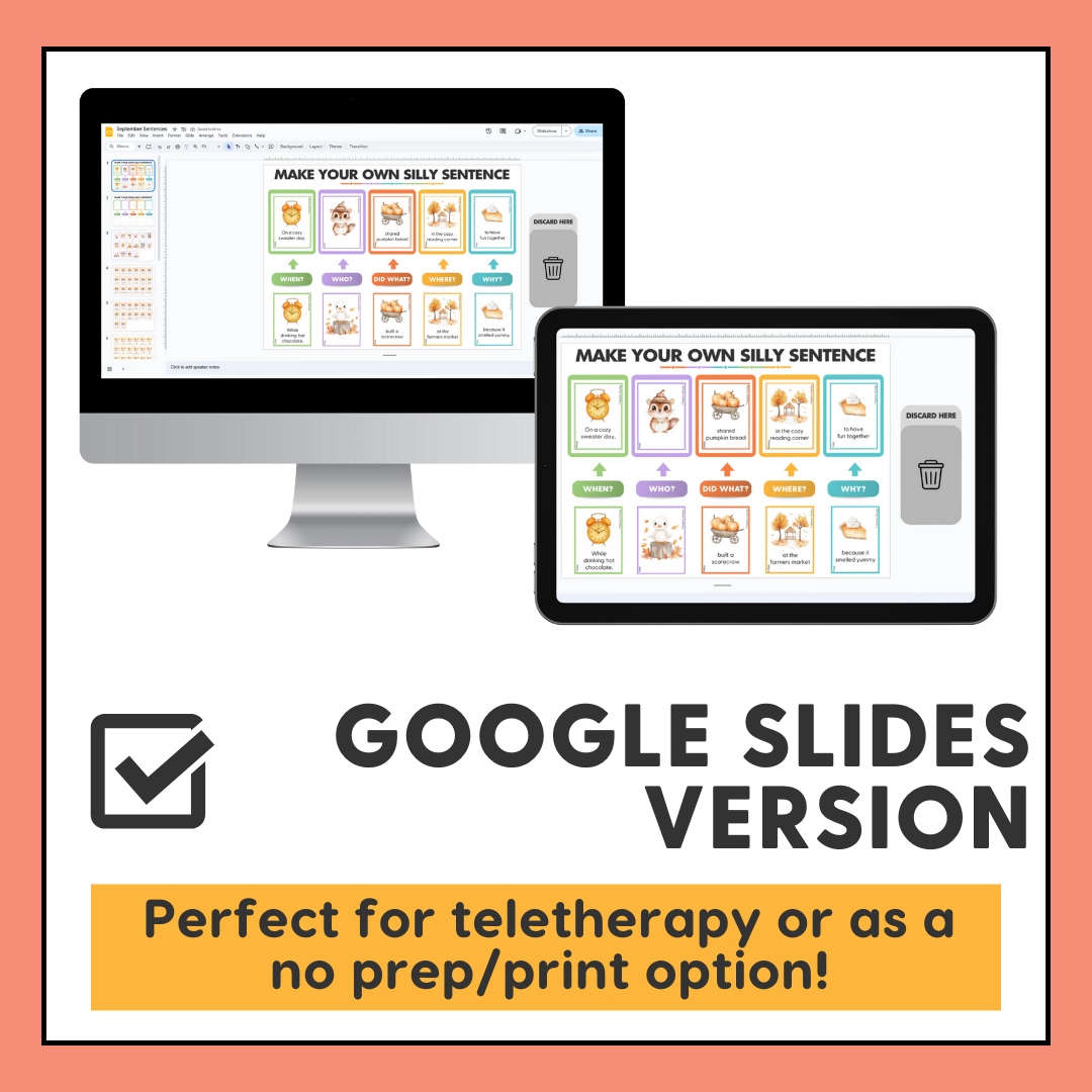 September Sentences is designed to help students build complete sentences using mix-and-match cards focused on “who,” “what,” “where,” “when,” and “why.” This resource supports expressive language, grammar, narrative development, and WH-question comprehension.